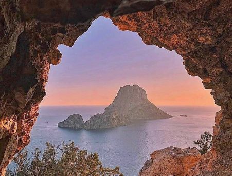 Nestled along the path to the Pirate Tower, this secretive hippy cave unveils one of the most breathtaking views of Ibiza—none other than the nature reserve of Es Vedra.