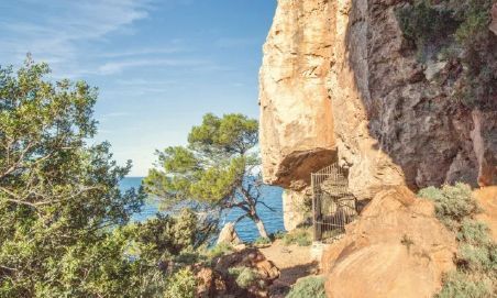 The Can Marçà Cave, also known as the Cave of San Miguel, is situated in a stunning natural setting adjacent to a viewpoint offering panoramic vistas of the Ferradura and Murada islets, as well as the Torre d'es Mular, on the cliffs of Puerto de San Miguel.