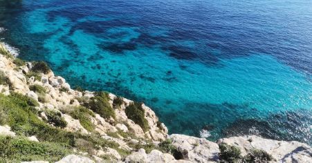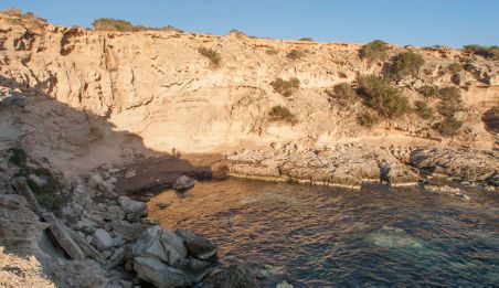 The coastline of Es Carnatge stretches along the northern section of the Formentera isthmus, connecting the Mola plateau to the western plateau where Sant Francesc is situated. In simpler terms, Es Carnatge constitutes the "northern coast" in relation to the beach or coast of Migjorn, which faces south. This coastal region is predominantly rocky, featuring small cliffs that never exceed 2 or 3 meters in height.