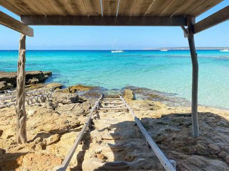Es Ram is a petite inlet that has historically served as a basic pier. Presently, it remains relatively secluded, making it an ideal choice if you seek a Formentera spot away from the crowds. Several piers dot the area, providing shelter for boats, reminiscent of those found on Es Pujols Beach or Cala Saona. Es Ram spans a mere 15 meters, with an ample accumulation of Posidonia during the winter months. Accessing the tiny bay requires locating small stairs carved into the rock. Alternatively, sunbathing is possible on the rocks.
